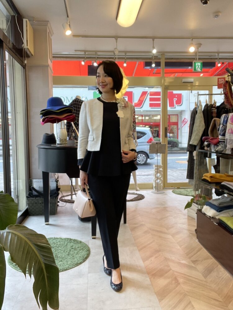 ジャケットを羽織ってコサージュを付けると式典スタイルに