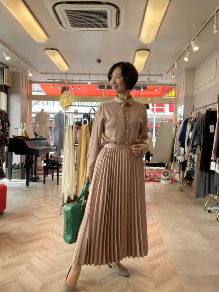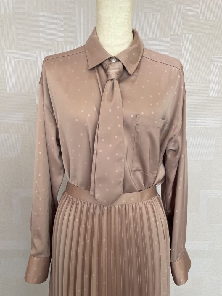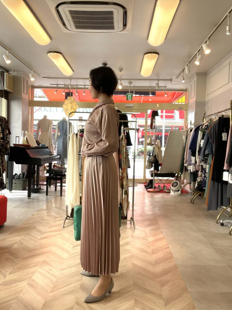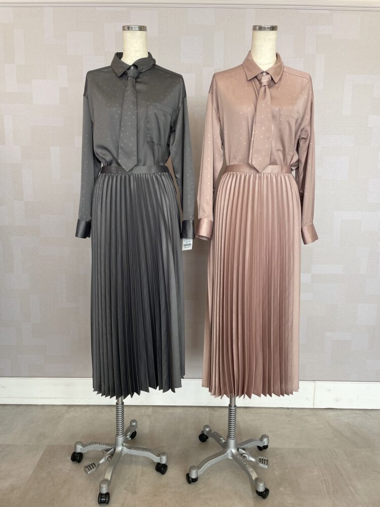 光沢感がきれいなブラウス&プリーツスカートのセットアップが入荷しています