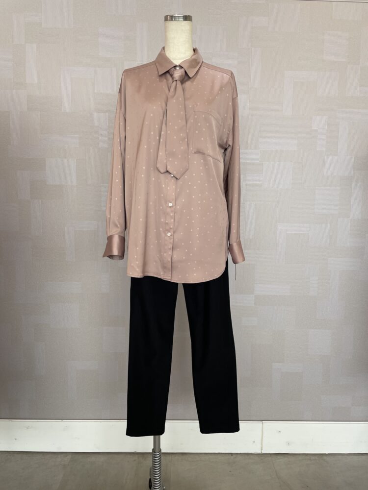 光沢タイ付きブラウスとプリーツスカートのセットアップ