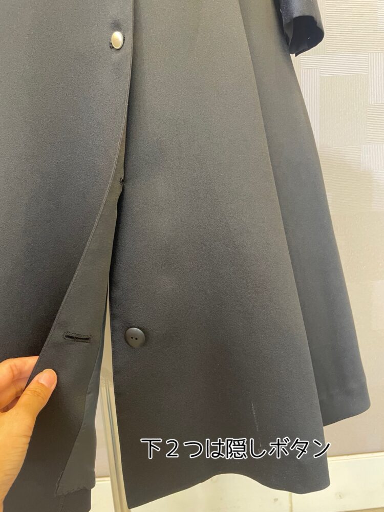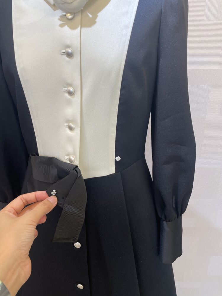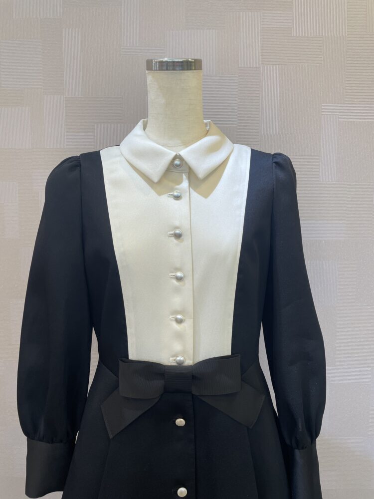 襟元の白の切り替えと光沢ボタンでイノセントな雰囲気に