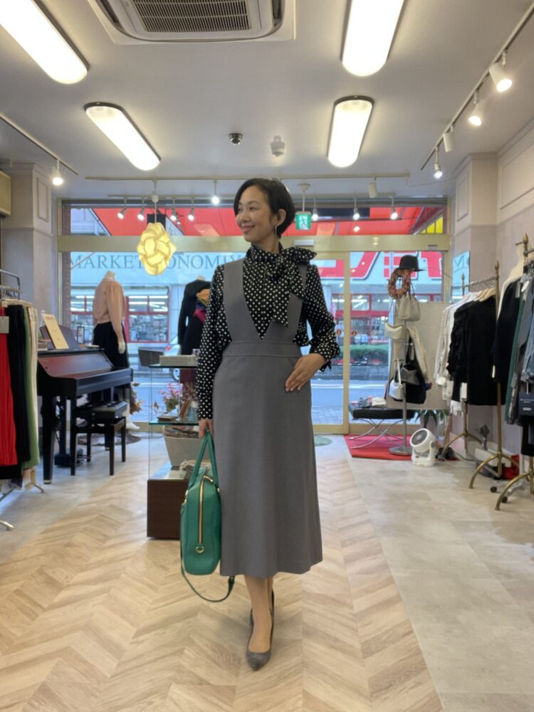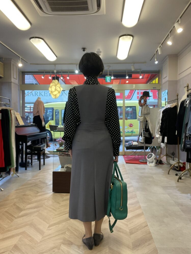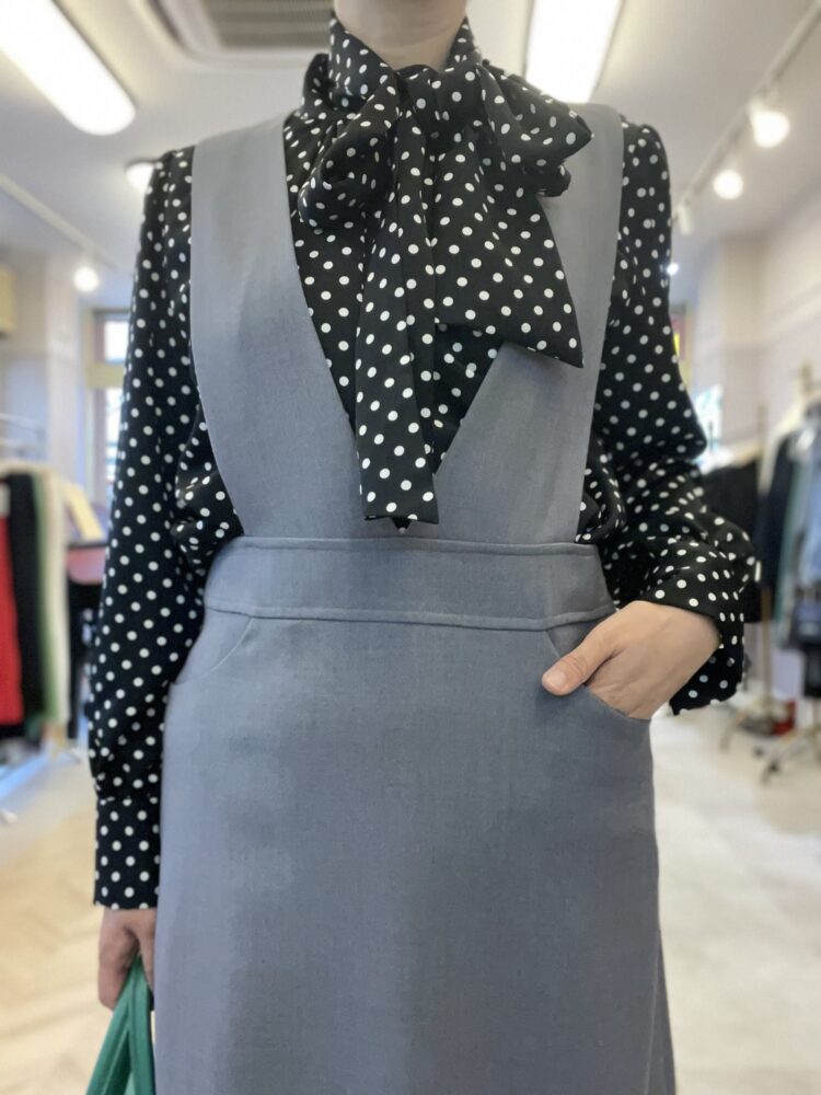 色はシックなグレーでジャンスカといってもカジュアル感控えめなのでお仕事にも着ていただけます