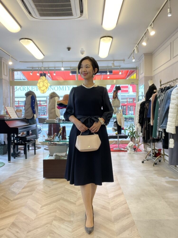 ◯袖の透け感が華やかなネイビーワンピース ¥28,600