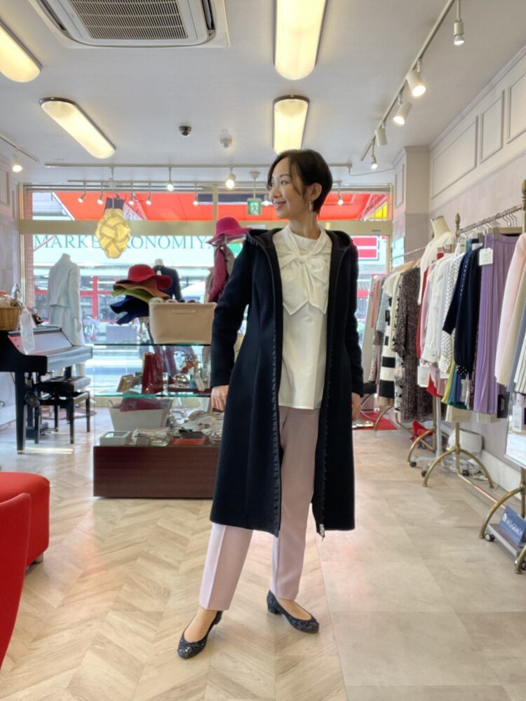 コートやダウンはダークなお色が多いかと思いますので中に着る洋服で軽さを出していくと