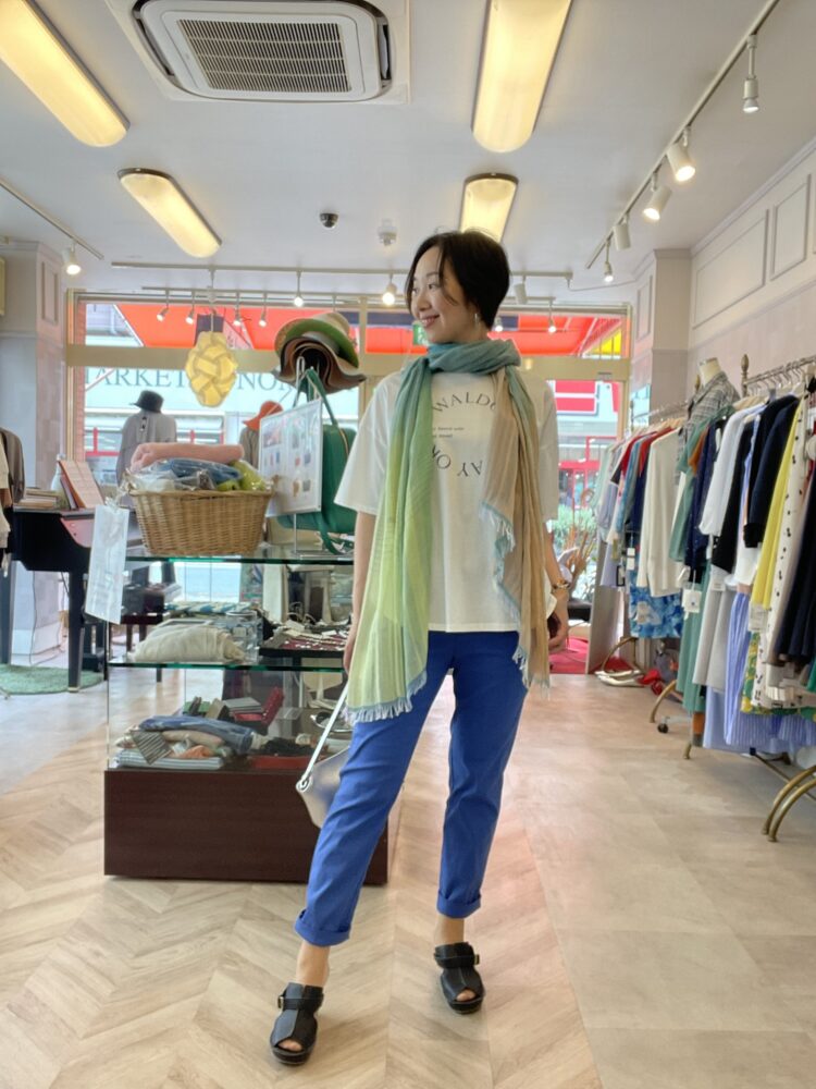 シンプルTシャツにはストールでワンポイント