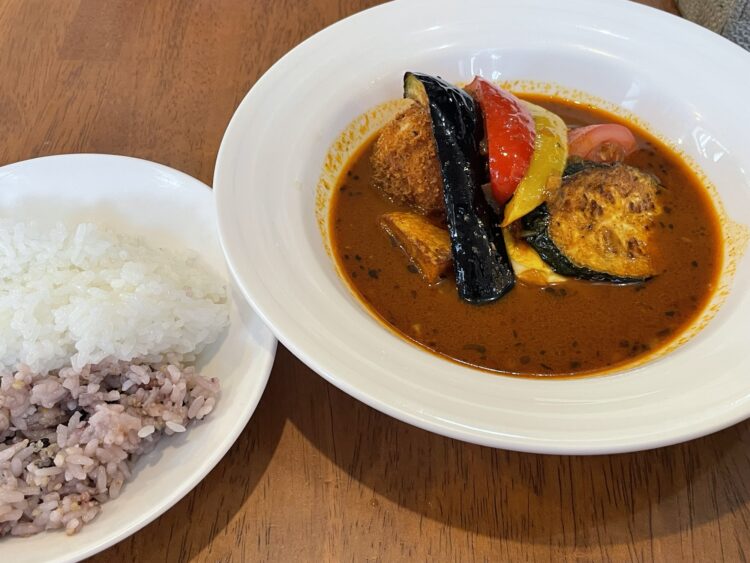 野菜がたくさんとクリームコロッケが載ったスープカレー🍛
