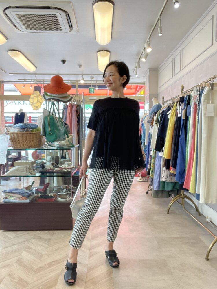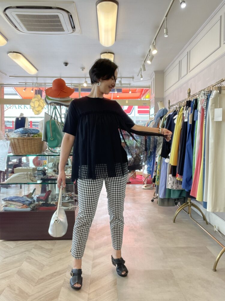 モノトーンのギンガムチェックパンツで涼しげな印象に