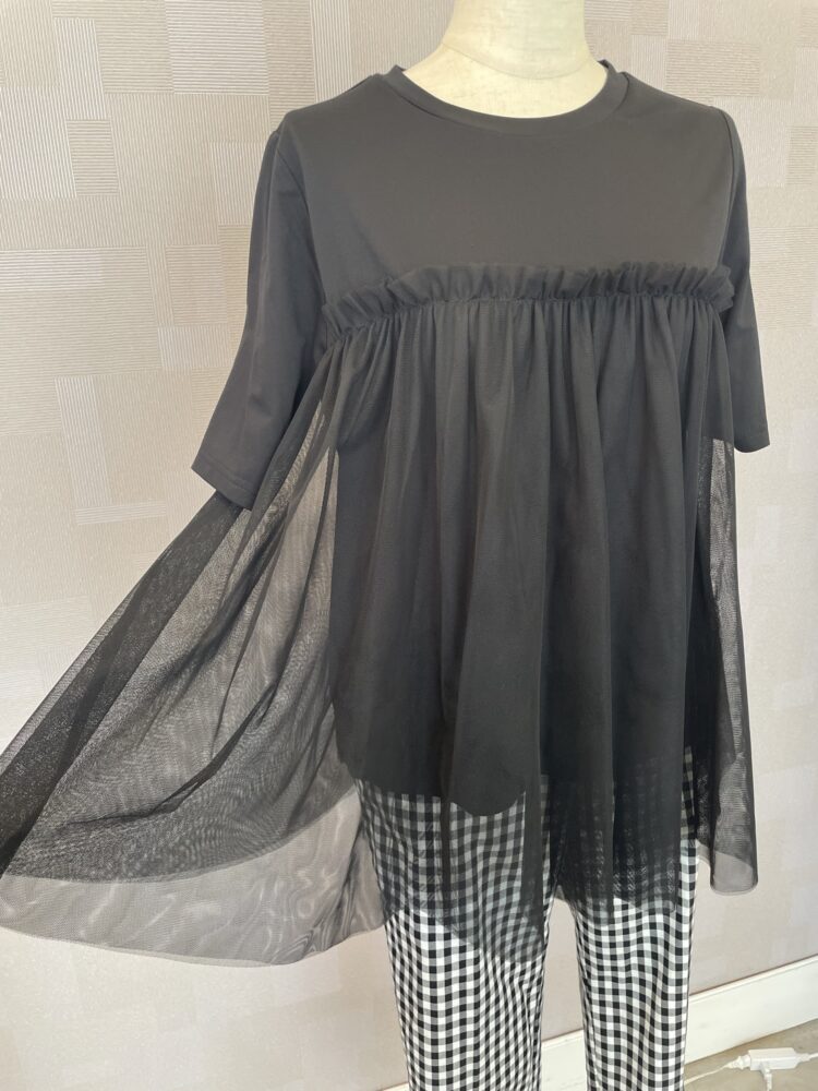 黒のカットソーに透け感チュールを重ねた