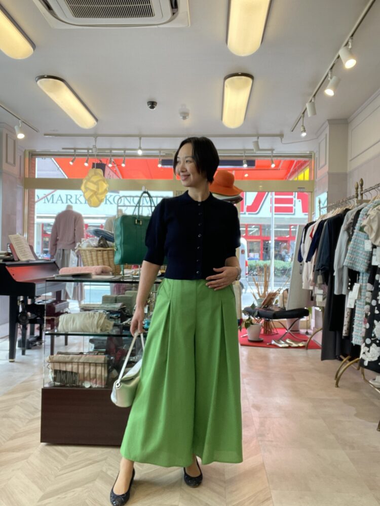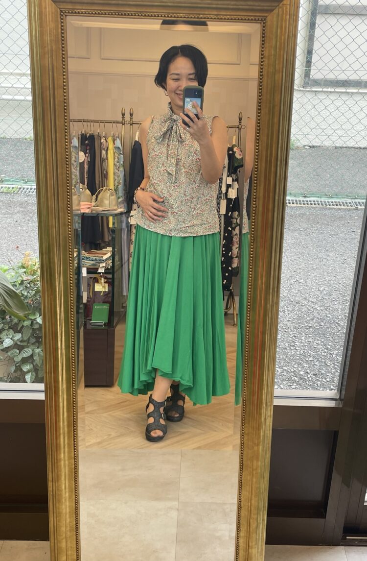 パッと明るいグリーンのスカートで
