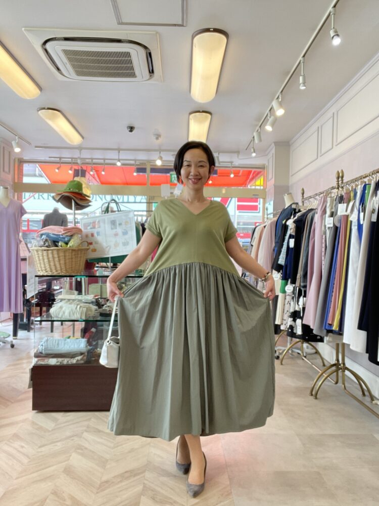 2.オリーブグリーンの切り替えワンピース ¥15,400