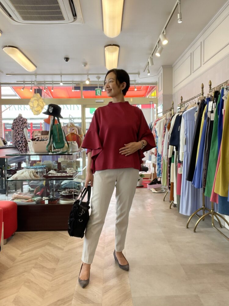 ワインカラーのフリル袖ブラウスで少しずつ秋モードへ