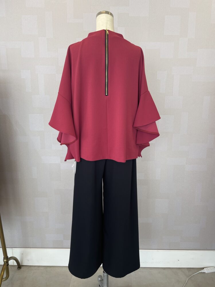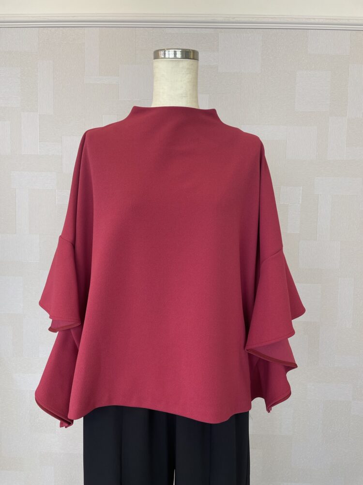 鮮やかなワインカラーのフリル袖ブラウスは
