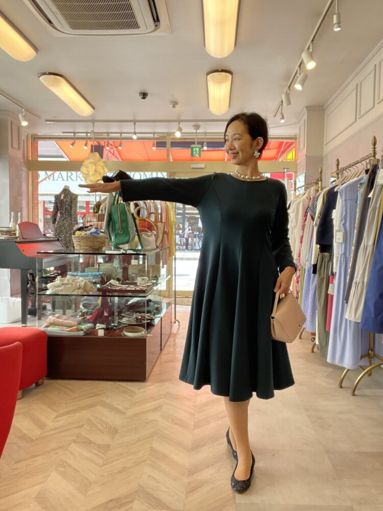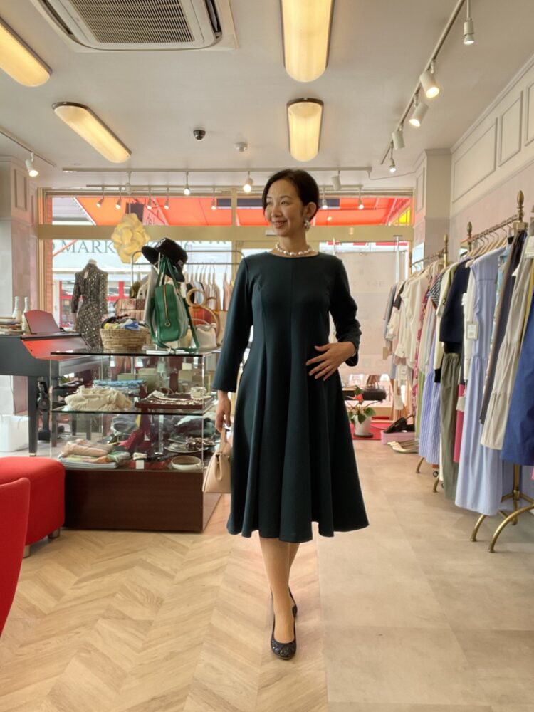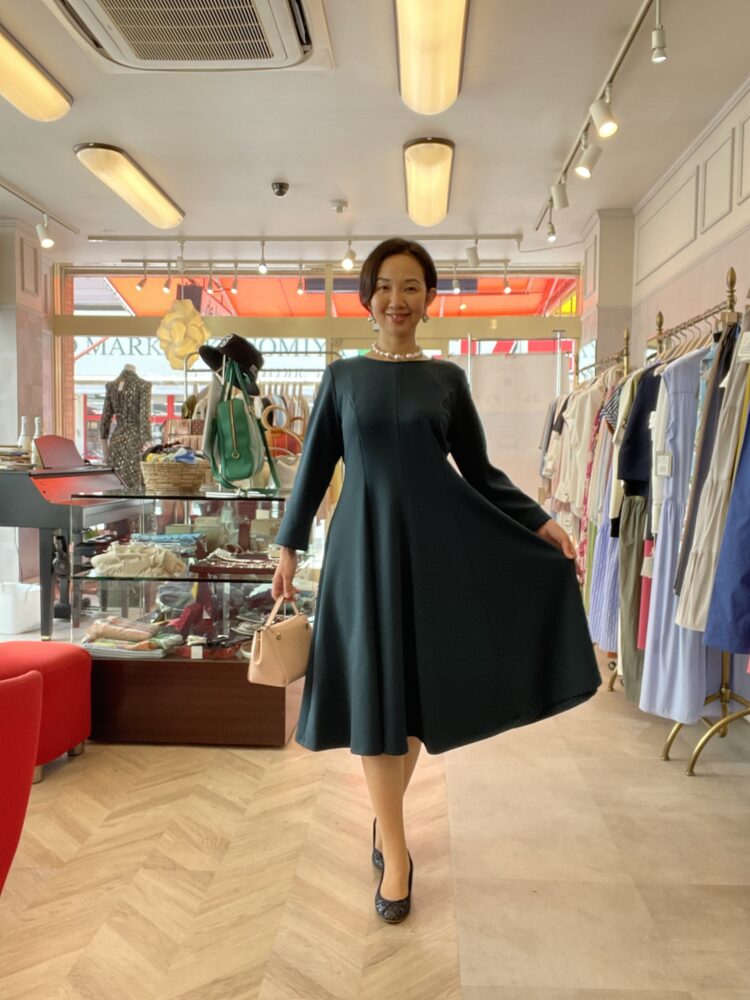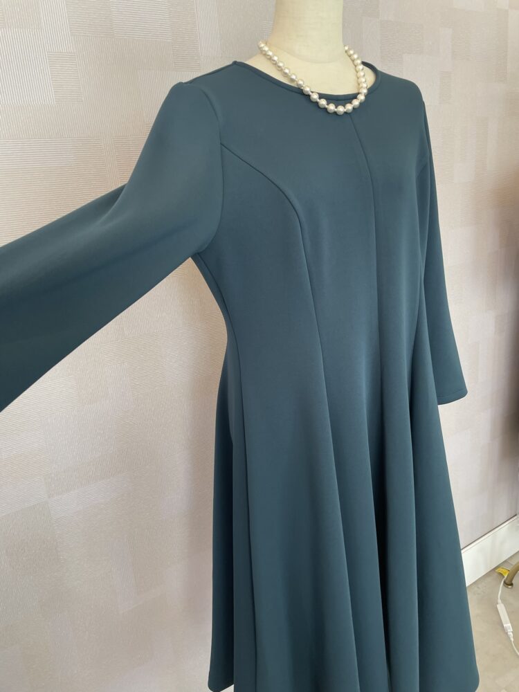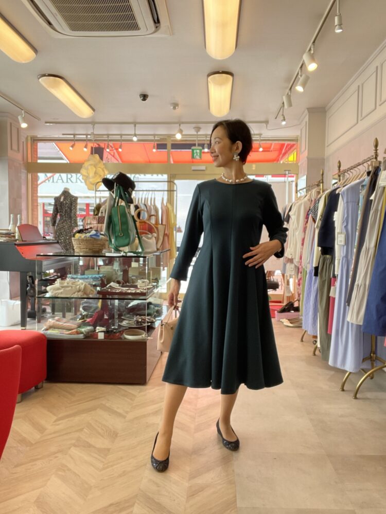 深みのあるダークグリーンが印象的なフレアワンピース