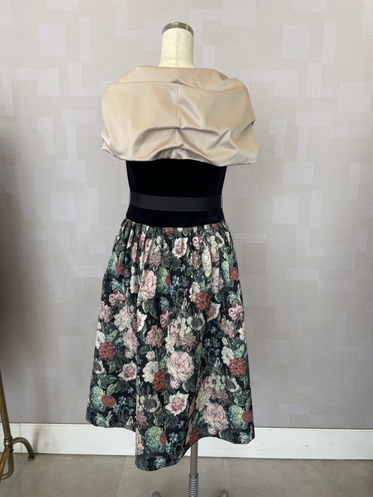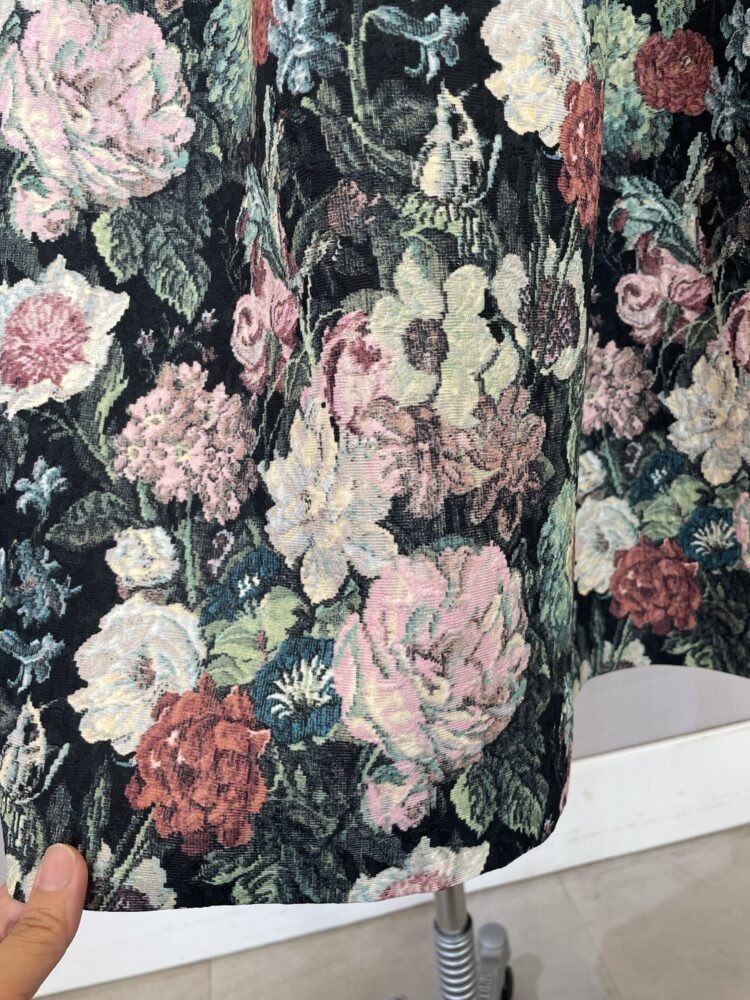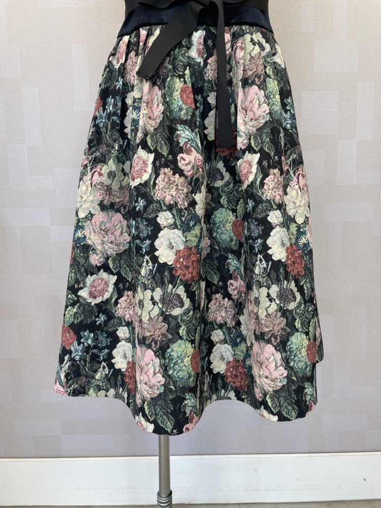 スカート部分にはクラシカルな花柄ゴブランをあしらい、まるで絵画のような華やかさを纏える一枚です