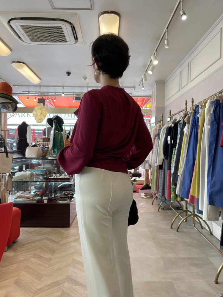 ◯夏素材のパンツやスカートも、黒・ネイビーならぐっと秋めく