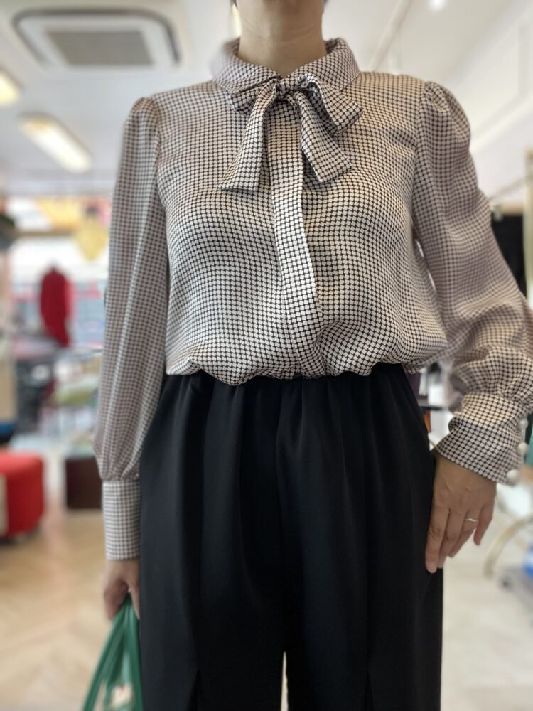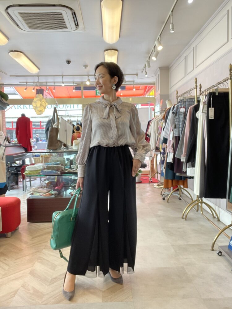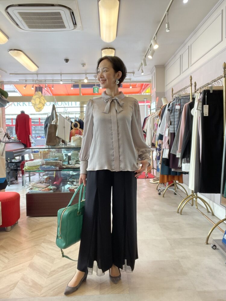 パンツスタイルがシャープになりすぎないリボンブラウス
