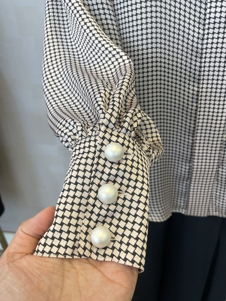 丸みを帯びた襟、パールボタンとエレガントさが際立ちます