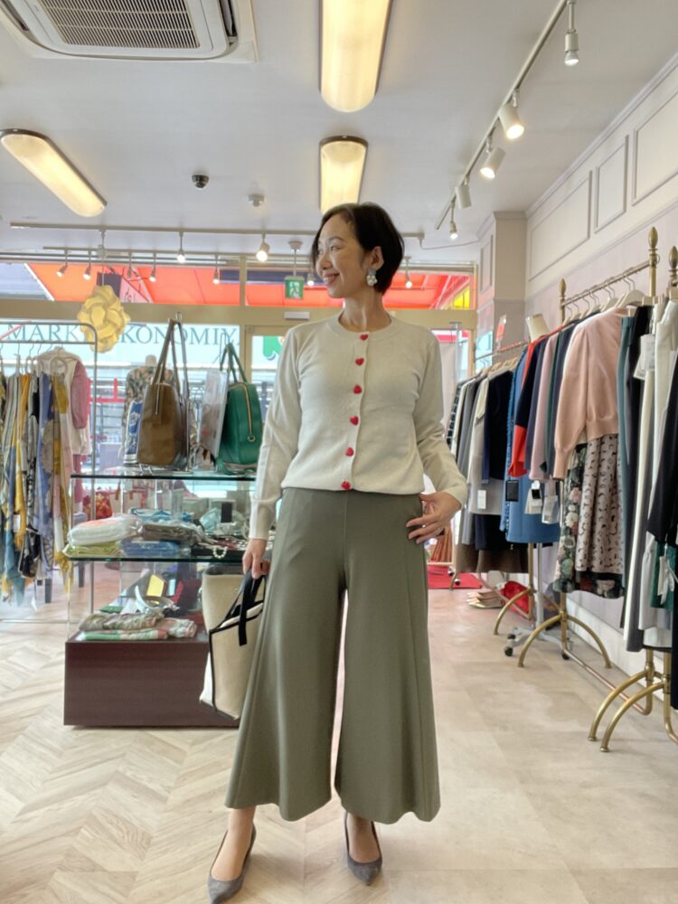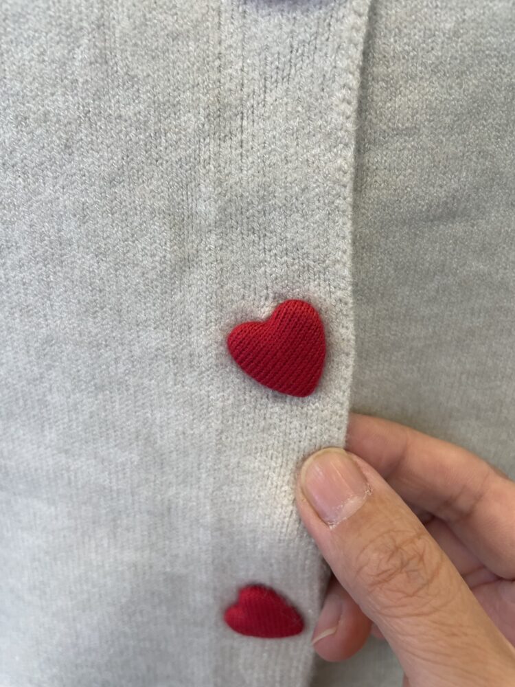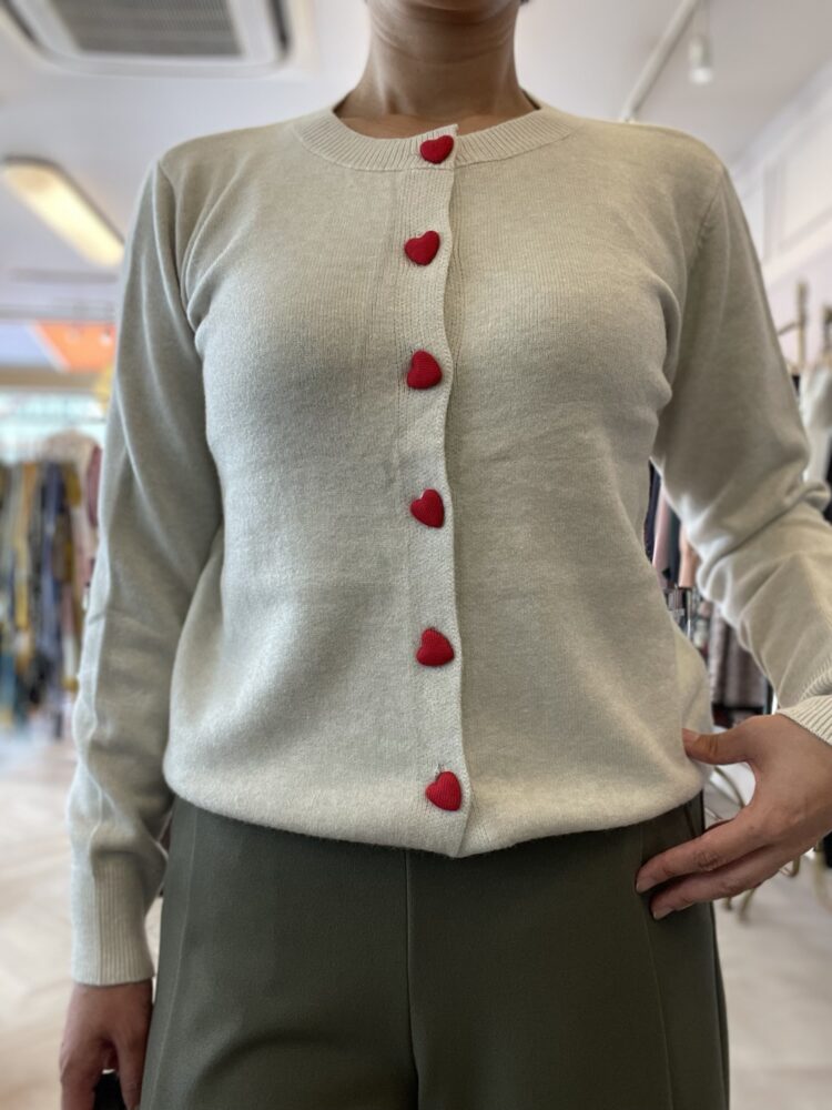 ハートボタンのカーディガンはほんのり遊び心を感じさせながらも、上品で大人の可愛げをプラス