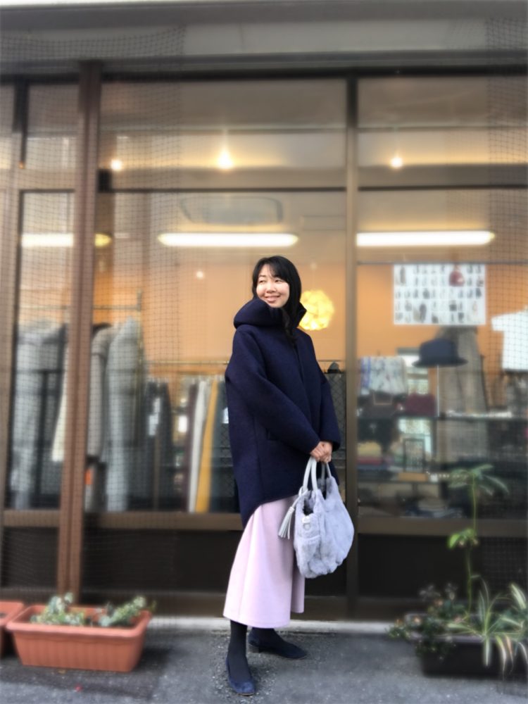 後ろが長いシルエットでスカートにもパンツにも合わせられる丈です。